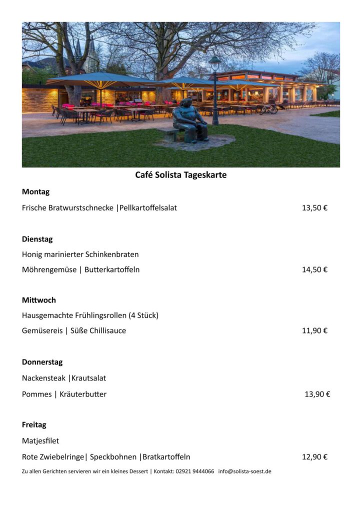 Gemeinsam mit stadtfuehrung-soest.de machen wir Euren Soest-Besuch komplett. Entdeckt die Geheimnisse unserer Stadt bei einer spannenden Führung und landet danach zu Belohnung bei uns im Solista. Ob Stadtgeschichte oder Tortentraum – bei uns bekommt Ihr beides. Wir freuen uns auf Euch! Über das Bild gelangt Ihr direkt zur Stadtführung, welche mit einem Tortentraum endet. Klickt drauf und lasst Euren Gaumen verwöhnen.